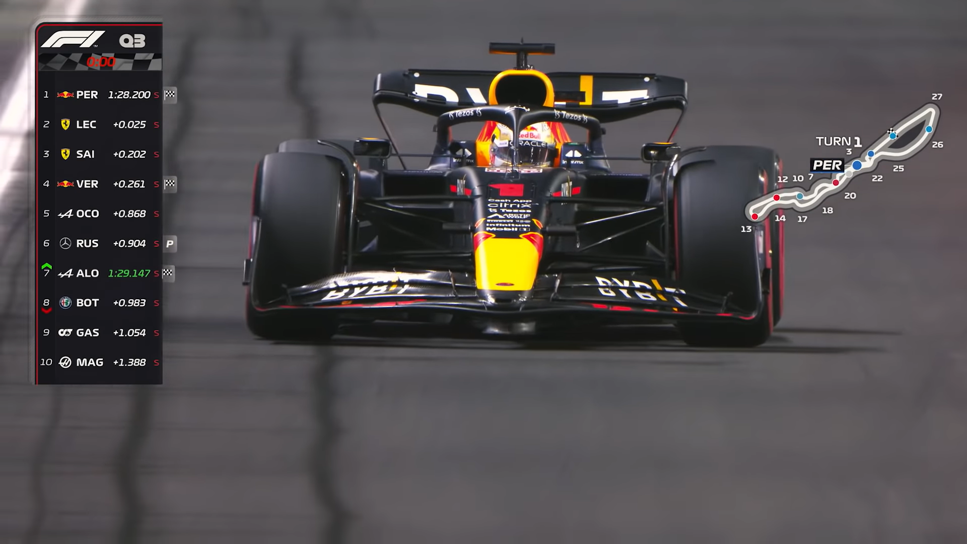 일찌감치 페라리의 샤를과 카를로스는 상위 기록을 마쳤다. 다만 레드불의 페레즈와 막스는?? 그중 페레즈는 페라리 원투펀치를 밀어내며, 레드불 레이서 사상 최초의 폴포지션을 차지하였다. 르노알핀의 오콘과 알론소는 P5, P7, 메르세데스의 러셀은 P6, 알파로메오의 보타스는 P8, 가슬리(알파타우리)와 케빈(하스)은 P9, P10을 차지하였다.